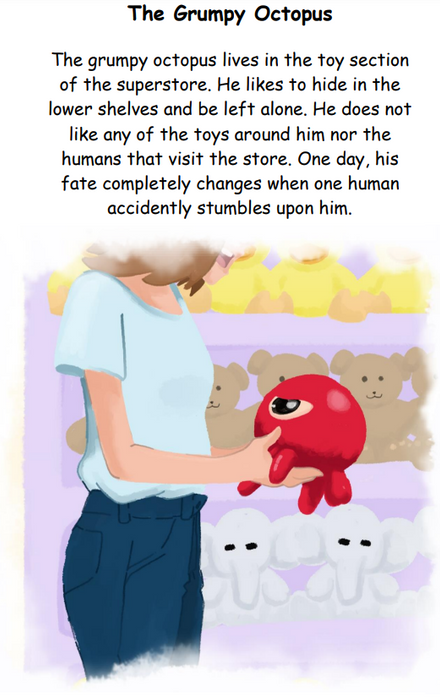 The grumpy octopus lives in the toy section of the superstore. He likes to hide in the lower shelves and be left alone. He does not like any of the toys around him nor the humans that visit the store. One day, his fate completely changes when one human accidently stumbles upon him. Find out what happens by clicking the "Buy Now" button right now!